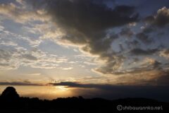 朝早くまだ誰もいない静かな池の畔で記念写真。大座法師池は自転車で一周できなそうなので、次の目的地の霊仙寺湖へ向かう。モワッと猛烈な蒸し暑さの中、朝日が昇ってきた。いかにも湿度が高そうな雲が空に広がっている。