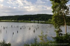 ぐるっと霊仙寺湖を回り込むと、立ち枯れの木々と湖畔に白いコテージが見える。ここで霊仙寺湖ともお別れ。
