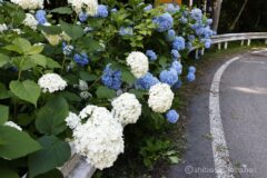 戸隠神社からはすぐに標高を下げ始める。九十九折のカーブには満開アジサイ。九十九折の抜けると戸隠神社火之御子社。