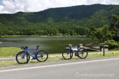 菜の花公園ひまわり~野沢温泉サイクリングへ出かける前に、北竜湖でチャリと記念写真。2台のバイクが並ぶのは珍しい。