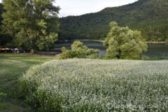 北竜湖は、周囲2kmほどのハート形をした小さな湖だ。周囲より高い位置にあり、山間部のひっそりとした雰囲気が気に入っている。春には菜の花畑になっている湖畔は、この時期は蕎麦畑になっており、白い蕎麦の花が満開だった。