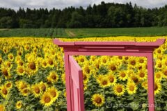 どこでもドアや看板を入れてみたり。ひまわりと山が一緒に写るかと思いきや、苗場山はひまわりの向く方向と重なるため、一緒に撮ることはできない。絡むのは反対側の名もなき山?だけ。