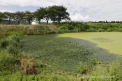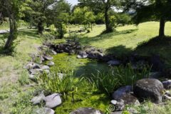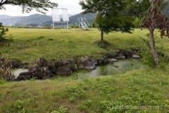 作品は桔梗原うるおい公園内にあり、駐車場はあるがトイレはなし。田園地帯にポツンと現れる癒しスポットといった感じだ。綺麗に石と水辺の植物で作られえたビオトープの向こうには、それらしいものが見える。