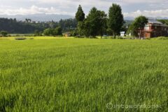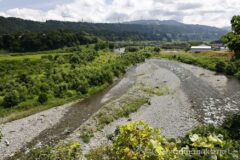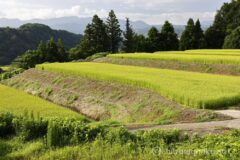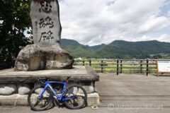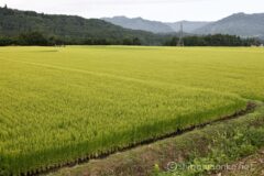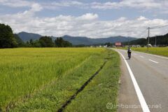 多少のアップダウンはあるけれど、ダウンヒルのときには遠くまで景色が見渡せてこれまた気持ちがいい。ダウンヒルを終えれば、再び一面の田園地帯。その奥には苗場山がそびえている。いやぁ、普段見慣れない風景というのはいい!”里の絶景”とでも言えばよいだろうか。