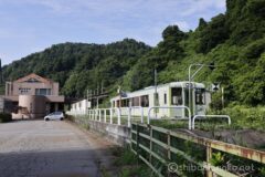 県道117号線に戻るために信濃川橋を渡るT字路にある公民館のような建物が、JR津南駅だ。ちょうど飯山線の列車を写真に収めることができた。一両編成のディーゼル車。これぞ旅情だね。