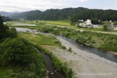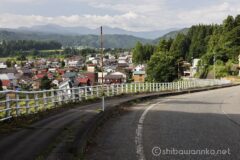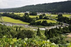 国道117号線に合流し、蛇行する信濃川に近づく場所にあるのが「信濃川の展望地」。蛇行する信濃川と田園地帯、外丸集落が美しい。