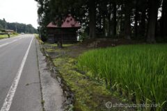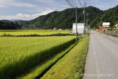 国道117号線ではなく、地図を見て適当に選んだ県道49号線が大正解。国道と違って車通りの少ない道を、田園風景の中をゆっくり走れる。背景に見えるのは苗場山だろうか。