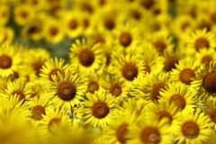 勢いのある綺麗な花にピントを合わせ背景のひまわりを圧縮すると、画面のほとんどがひまわりで埋まってくれる。忙しく働くハチさんも写り込み、いい感じに仕上がった。