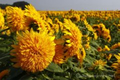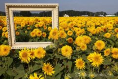 ひまわりの状態は最高。初めて見る八重ひまわりは、巨大なたんぽぽのようにも見える。中には普通のひまわりも混ざっていて、おそらく種が混ざってしまったのだろう。そうして見ると、普通のひまわりがより一層美しく見えた。青空と一緒に撮って見たり。背景のひまわりと重ねてみたり。ひまわりがぎっしりと密に咲いているので、いろんなカットを撮ることができる。朝早く人が少なかったので、額縁にチャリをはめて写真撮ってみたり。