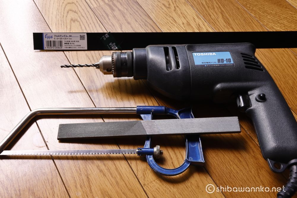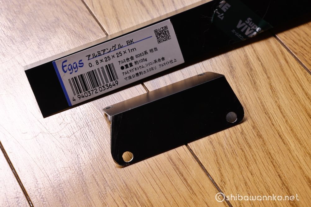 アルミアングルに切り取り線を書いて、糸鋸で切断。計4ヵ所ボルト穴を開けて、エッジを金属やすりで丸める、という作業工程。やや手先の器用さが要求されるか。